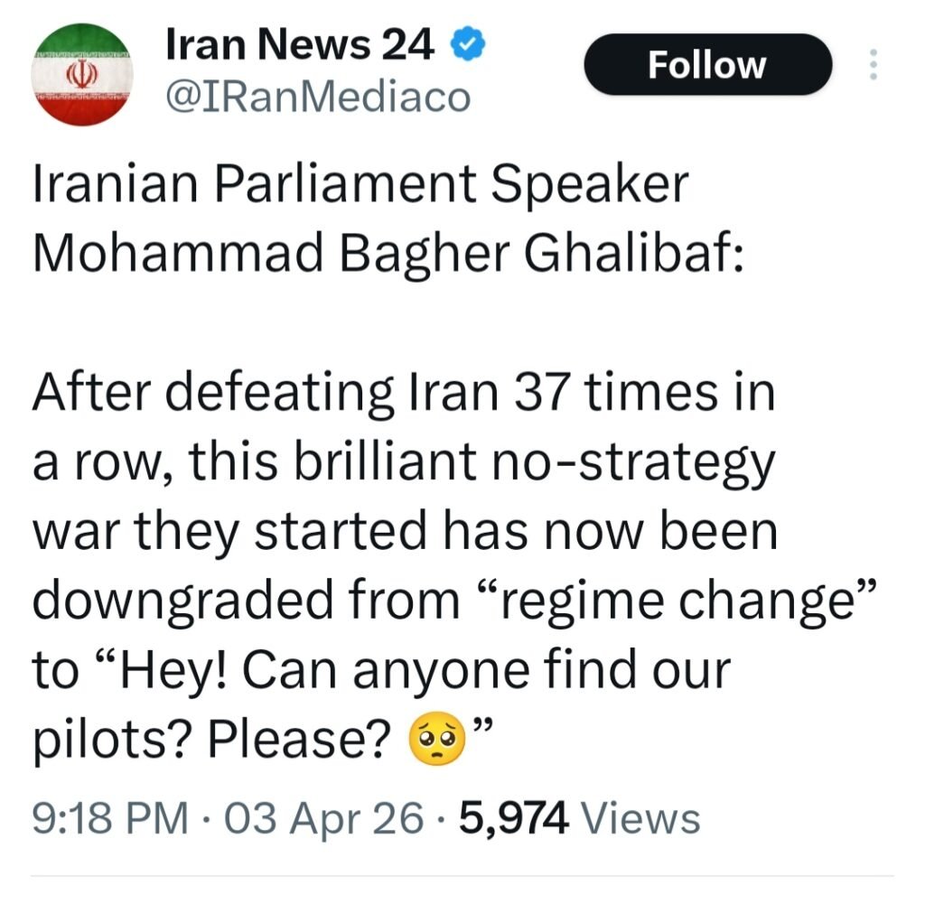 “ईरान को लगातार 37 बार हराने के बाद, उन्होंने जो यह ‘बिना किसी रणनीति वाला शानदार युद्ध’ शुरू किया था, वह अब ‘सत्ता परिवर्तन’ से घटकर इस स्तर पर आ गया है कि— “अरे! क्या कोई हमारे पायलटों को ढूँढ़ सकता है? प्लीज़?”