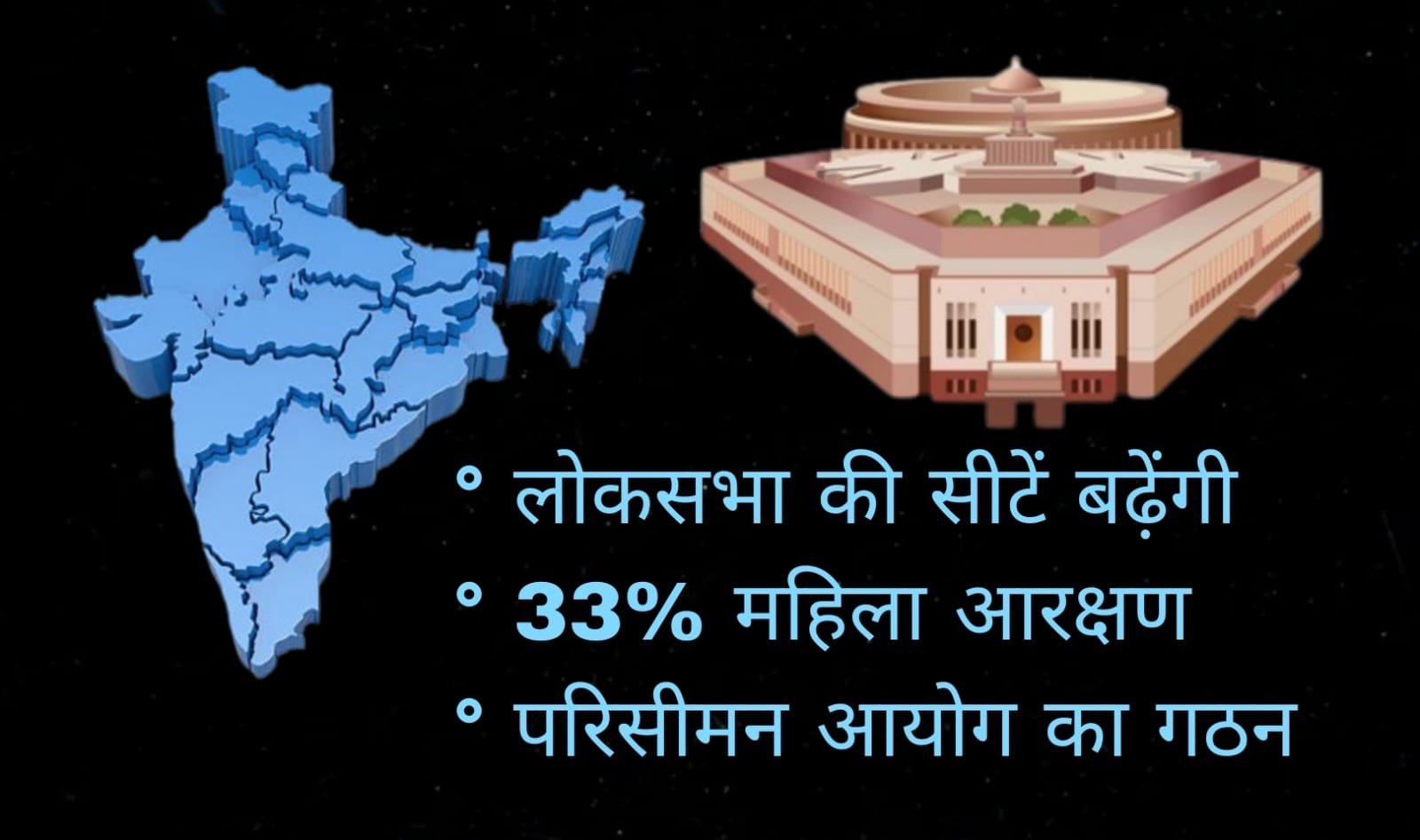 केंद्र सरकार 16 से 18 अप्रैल तक संसद का एक विशेष सत्र बुलायी है। संसद सूत्रों के अनुसार, इस सत्र में एक ऐसा बिल पेश किया जा सकता है, जिसके तहत लोकसभा सीटों की संख्या बढ़ाकर 816 कर दी जाएगी, ताकि इनमें से 273 अर्थात 33 प्रतिशत सीटें लोकसभा और सभी विधानसभाओं में महिलाओं के लिए आरक्षित की जा सकें और साथ देश में परिसीमन आयोग के गठन के विषय में सरकार विधेयक लाने जा रही है