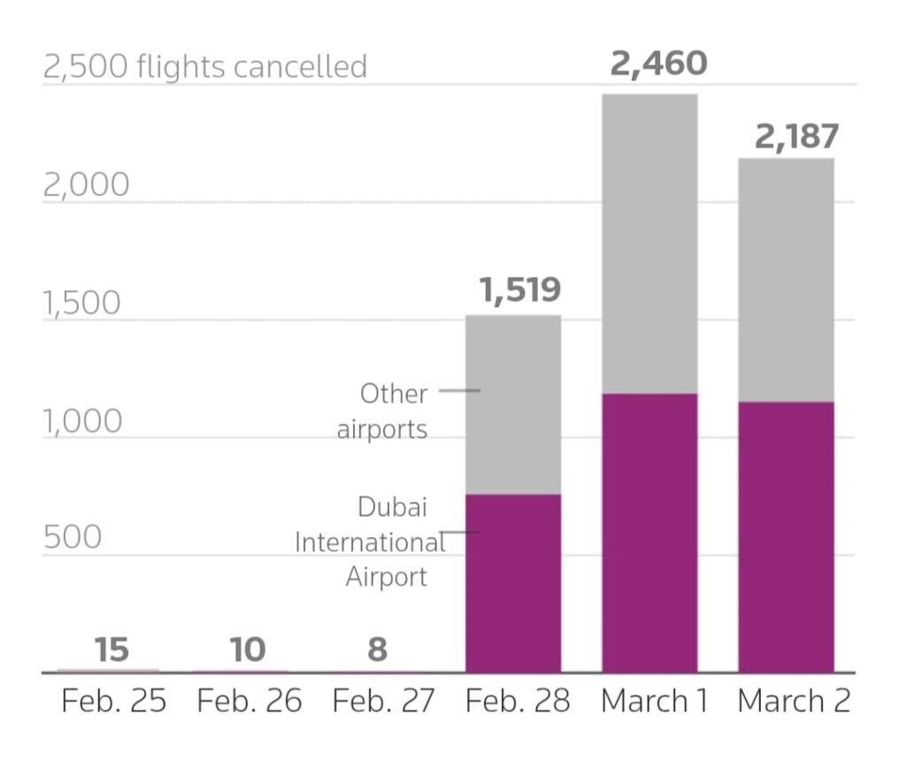 उपरोक्त आंकड़ों से पता चलता है कि 2 मार्च तक सात देशों में कैंसिलेशन हुए या वहाँ पहुँचे हैं, जिनका एयर स्पेस बंद है, ईरान, इराक, कुवैत, इज़राइल, बहरीन, क़तर और सीरिया। ईरान में कैंसिलेशन की गिनती कम हो सकती है।