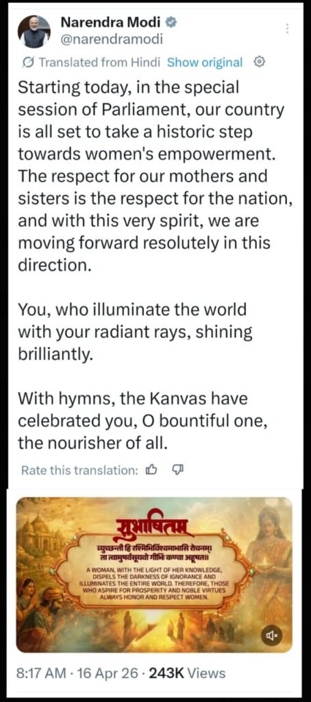 बता दें कि प्रधानमंत्री मोदी ने संसद के विशेष सत्र की बैठक की शुरुआत से पहले महिला सशक्तीकरण को लेकर बड़ा संकेत दिया है, सोशल मीडिया एक्स पर अपने संदेश में पीएम मोदी ने कहा कि इस विशेष सत्र में देश नारी सशक्तीकरण के लिए ऐतिहासिक कदम उठाने जा रहा है, उन्होंने जोर देते हुए कहा कि माताओं और बहनों का सम्मान ही राष्ट्र का सम्मान है और इसी भावना के साथ सरकार इस दिशा में दृढ़ता से आगे बढ़ रही है, अपनी पोस्ट में प्रधानमंत्री मोदी ने संस्कृत के एक श्लोक का भी उल्लेख किया, जो नारी शक्ति के तेज और उसकी महत्ता को दर्शाता है।